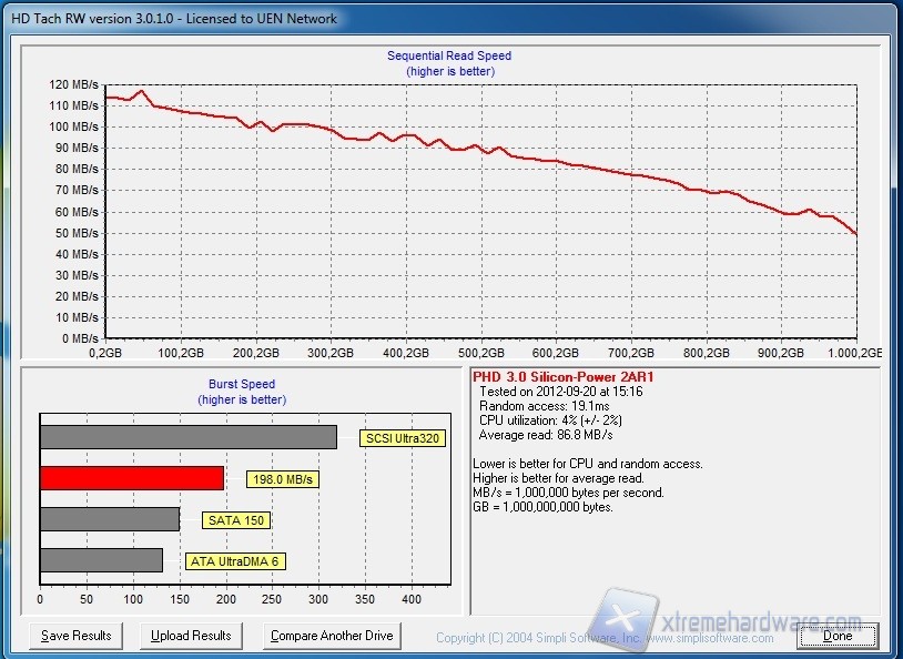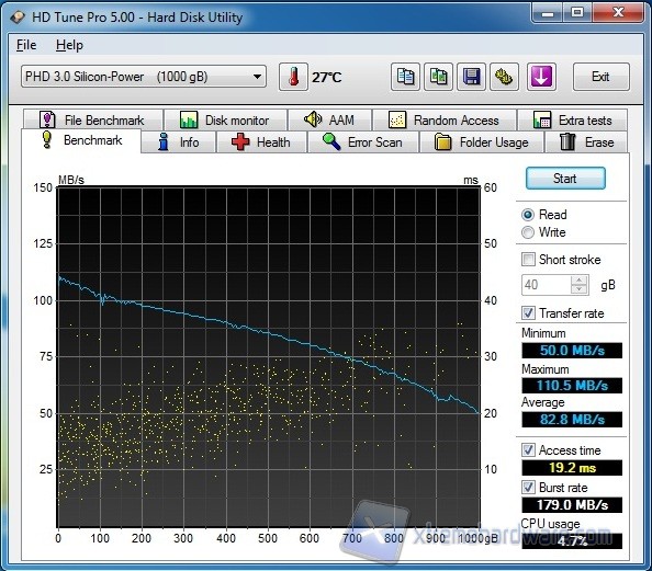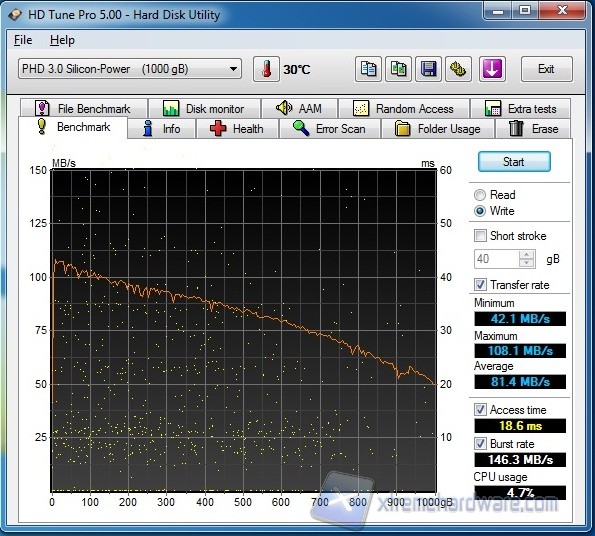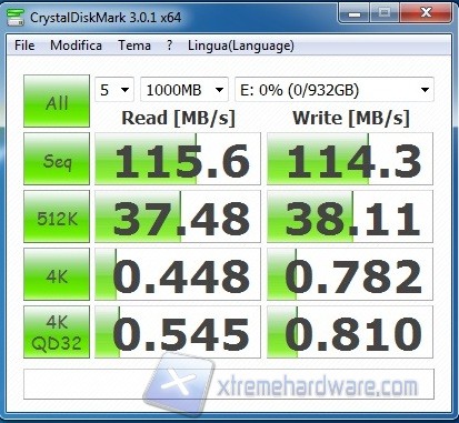 I valori ottenuti relativi al benchmark sia in lettura sia in scrittura dimostrano le ottime prestazioni del disco, che si attestano in entrambi i casi attorno ai 100-110 MB/s. Nella media degli HD 2,5” gli access time, che risultano attorno ai 19 ms.